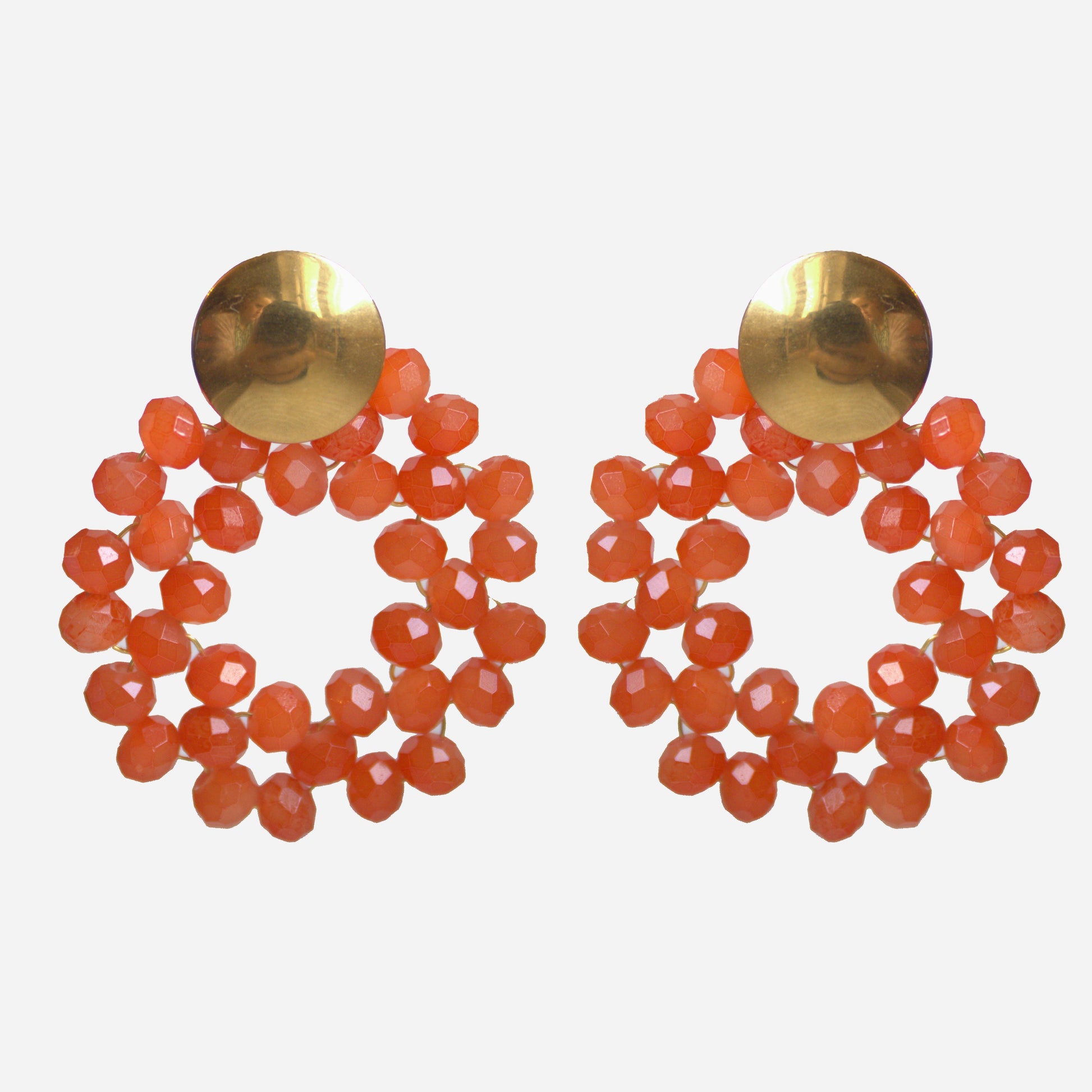 Introducing Anne in blood orange. These Anne earrings feature a beautiful combination of blood-orange colored glass beads and a golden closure for a classic, elegant look. These earrings have a unique cloud shape design, making them a timeless addition to any wardrobe.