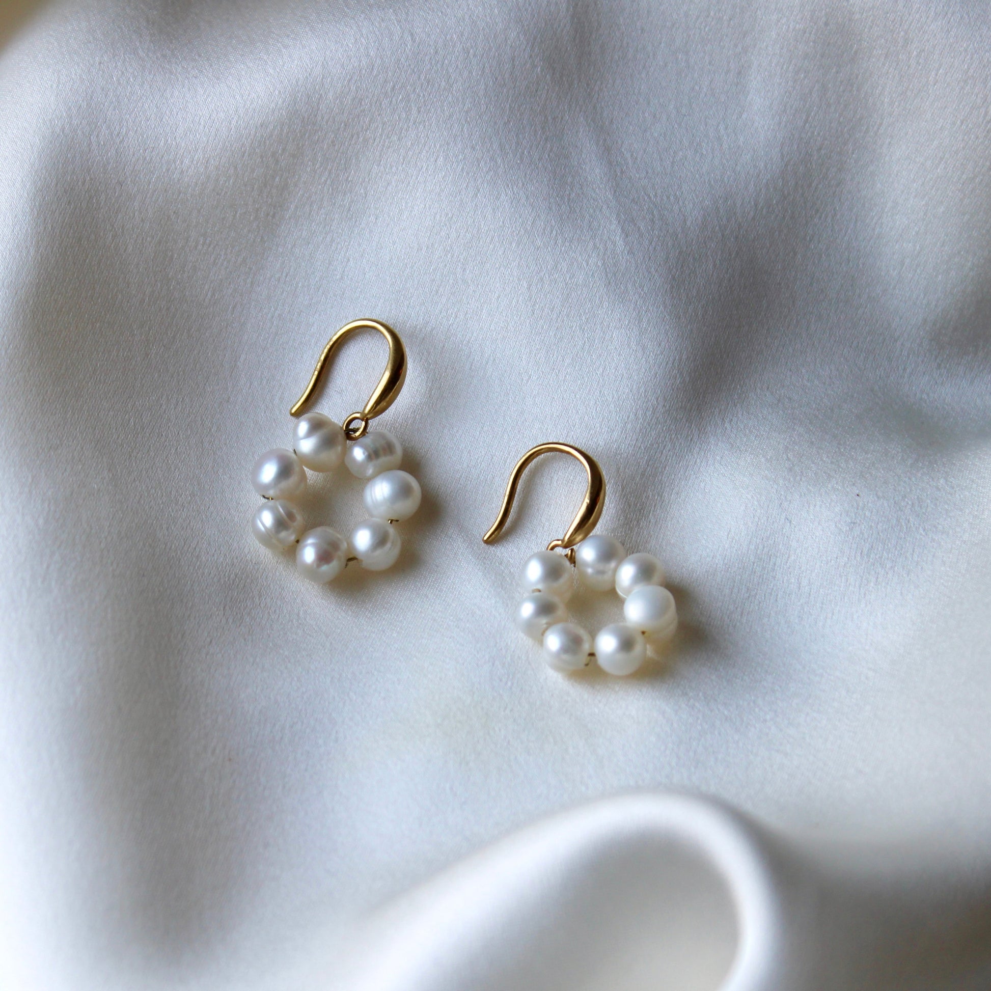 Beautiful golden earrings with a unique freshwater-pearl circle dangling from it! Elegant, timeless and stunning!