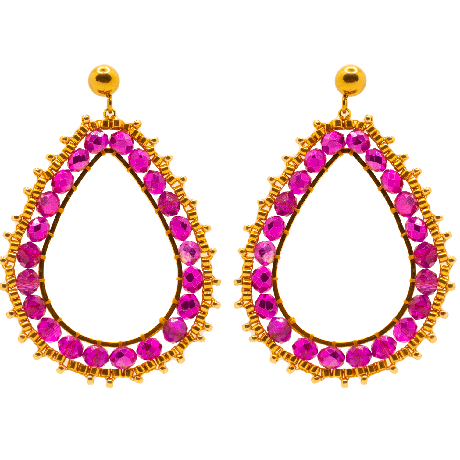 These Roxanne Earrings are elegantly designed, with neon-pink Chinese crystal beads highlighted by a golden trim. Accentuated with intricate details, these earrings are perfect for adding a hint of sophistication to any look.